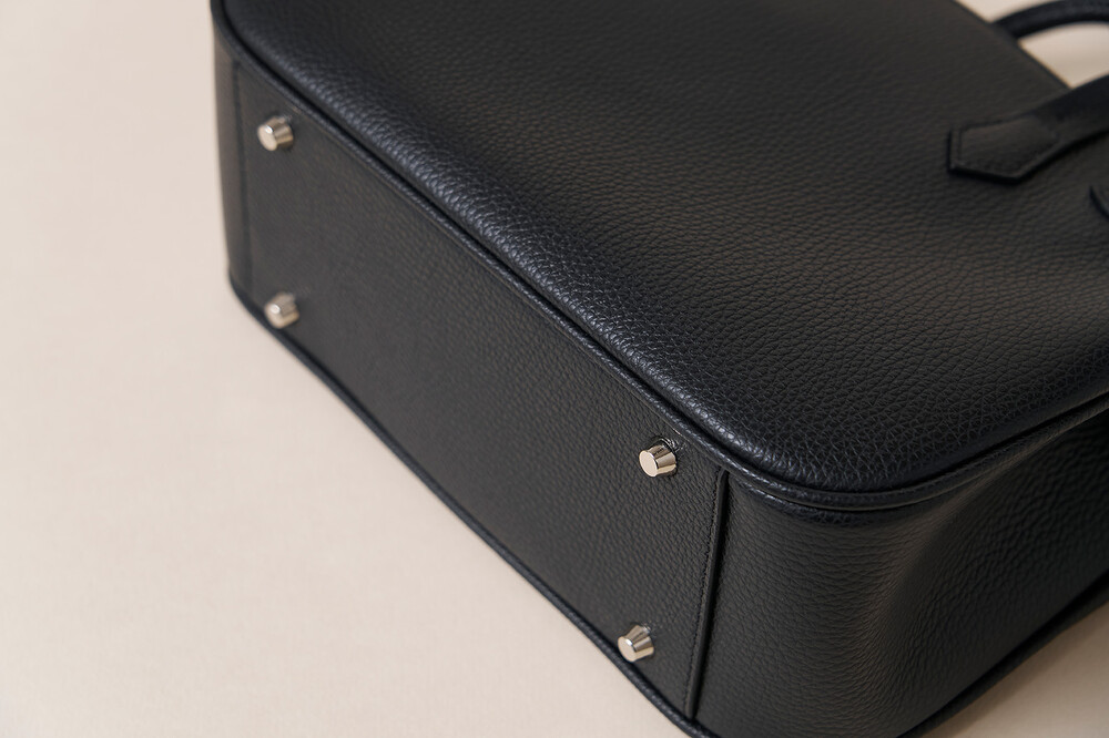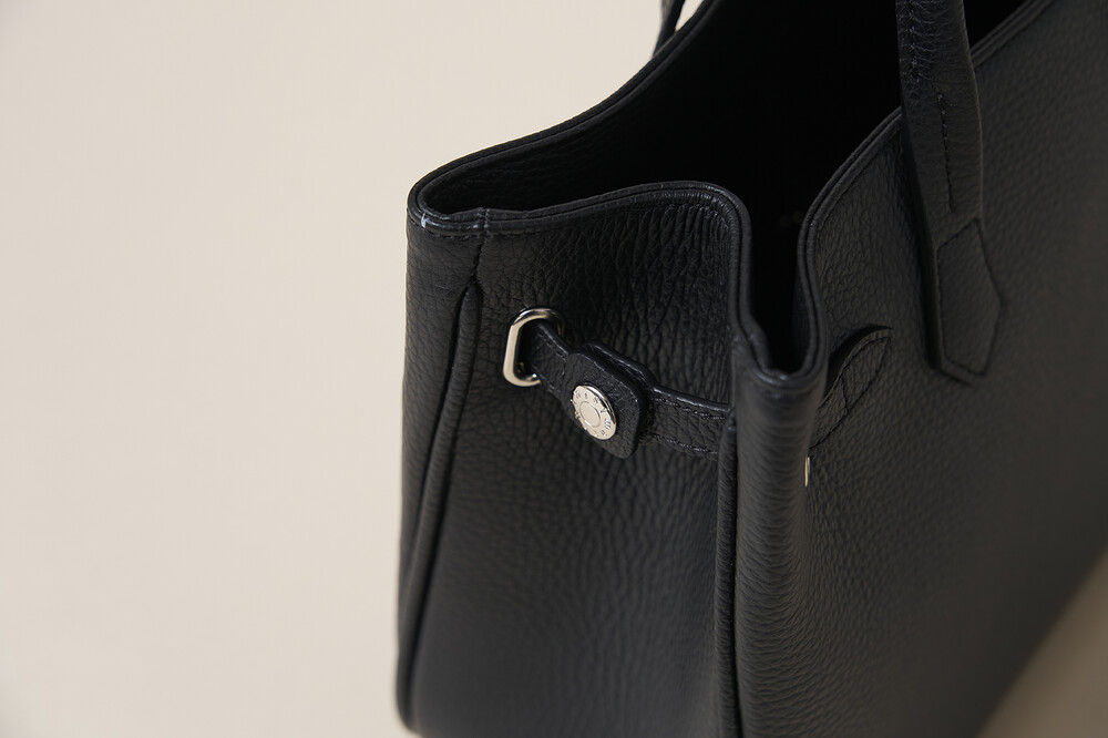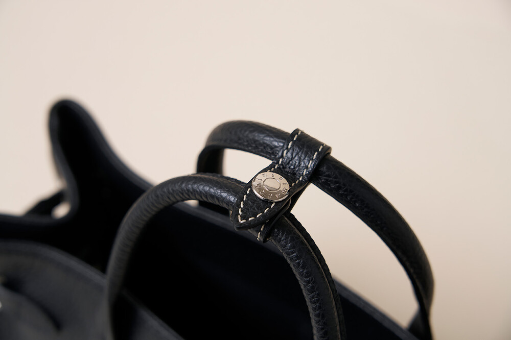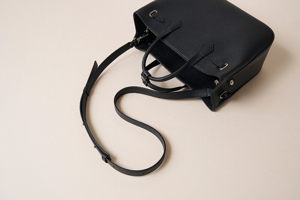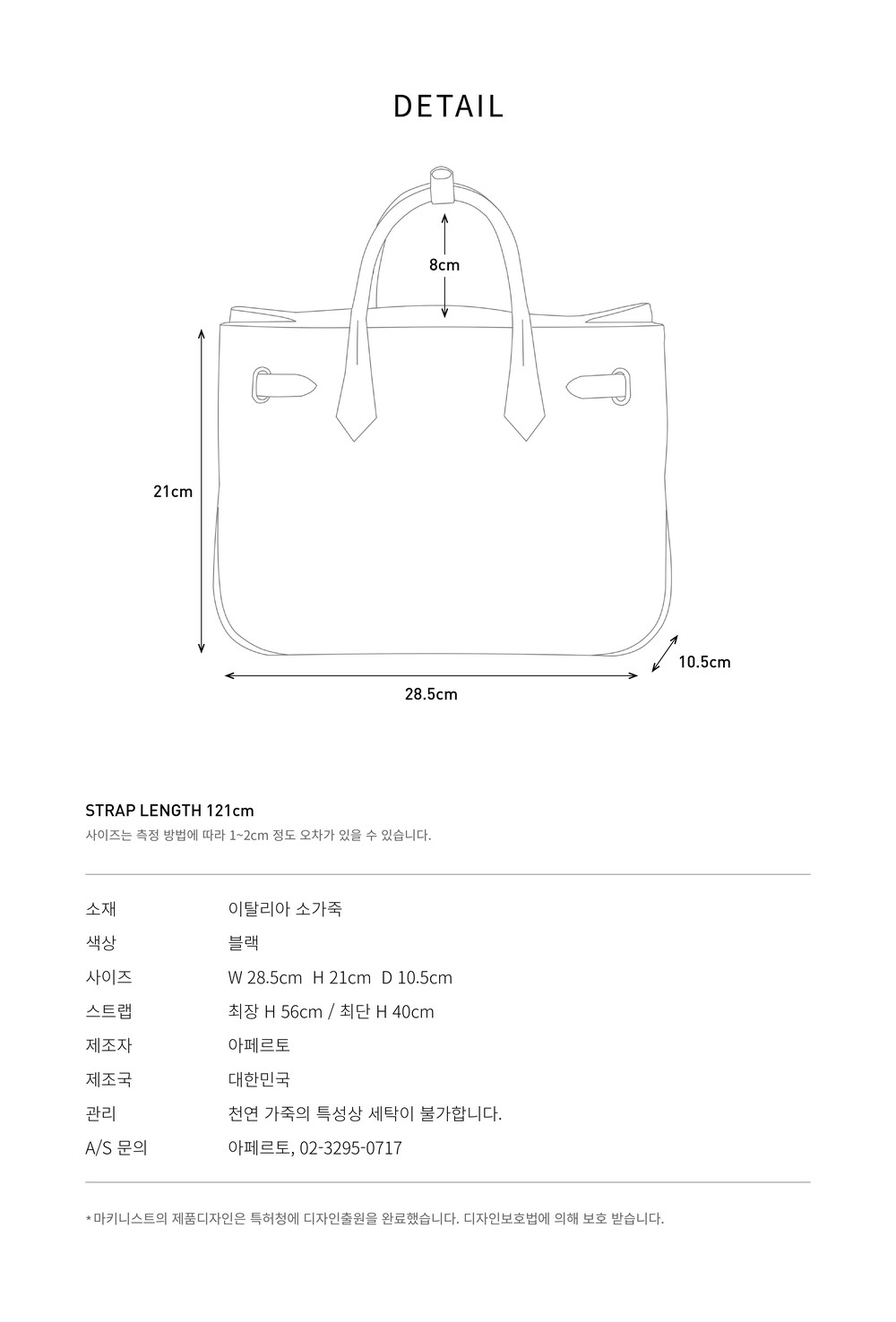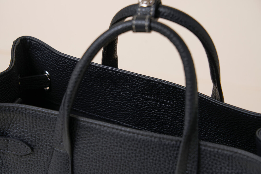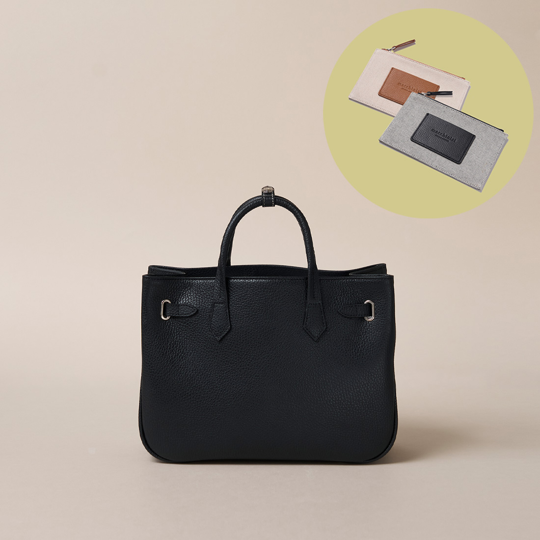 몸체는 부드러운 이탈리아 소가죽과 말랑한 보강재로 탄성과 유연함이 느껴지며, 바닥은 형태를 유지할 수 있도록 탄탄하게 보강되어 있습니다. 핸들은 아래로 쳐지거나 꺾이지 않도록 설계되어 손으로 들거나 손목에 가볍게 걸칠 수 있습니다.