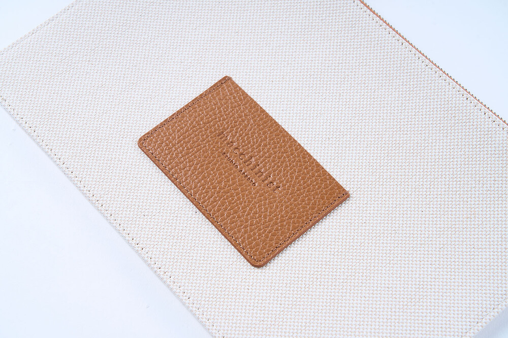 파우치의 내부에는 안감이 대어져 있으며, 앞면에는 카드 홀더가 마련돼 있습니다.