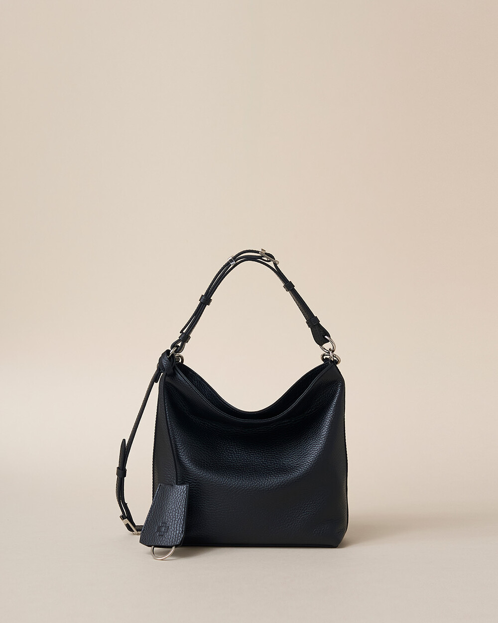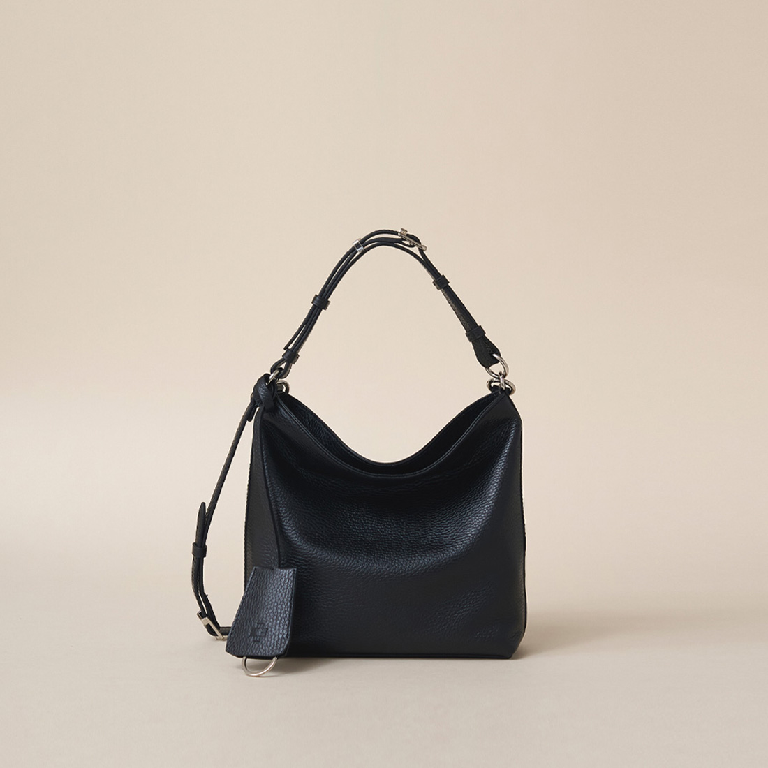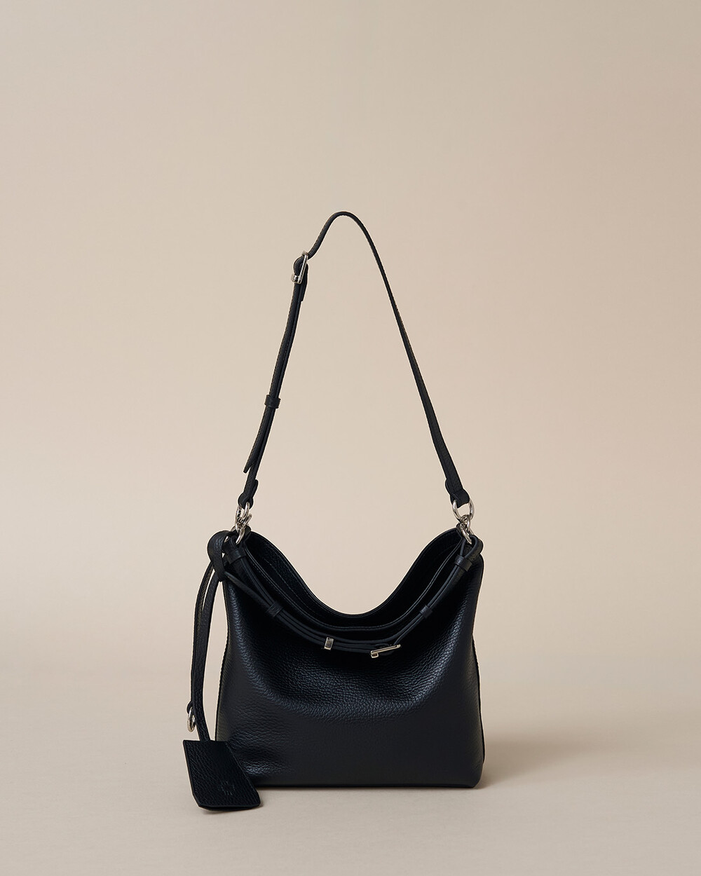 앞부분에 늘어뜨린 버클 핸들은 장식적인 효과를 주는 동시에 핸들을 들어올려 토트 스트랩으로 활용할 수 있습니다.