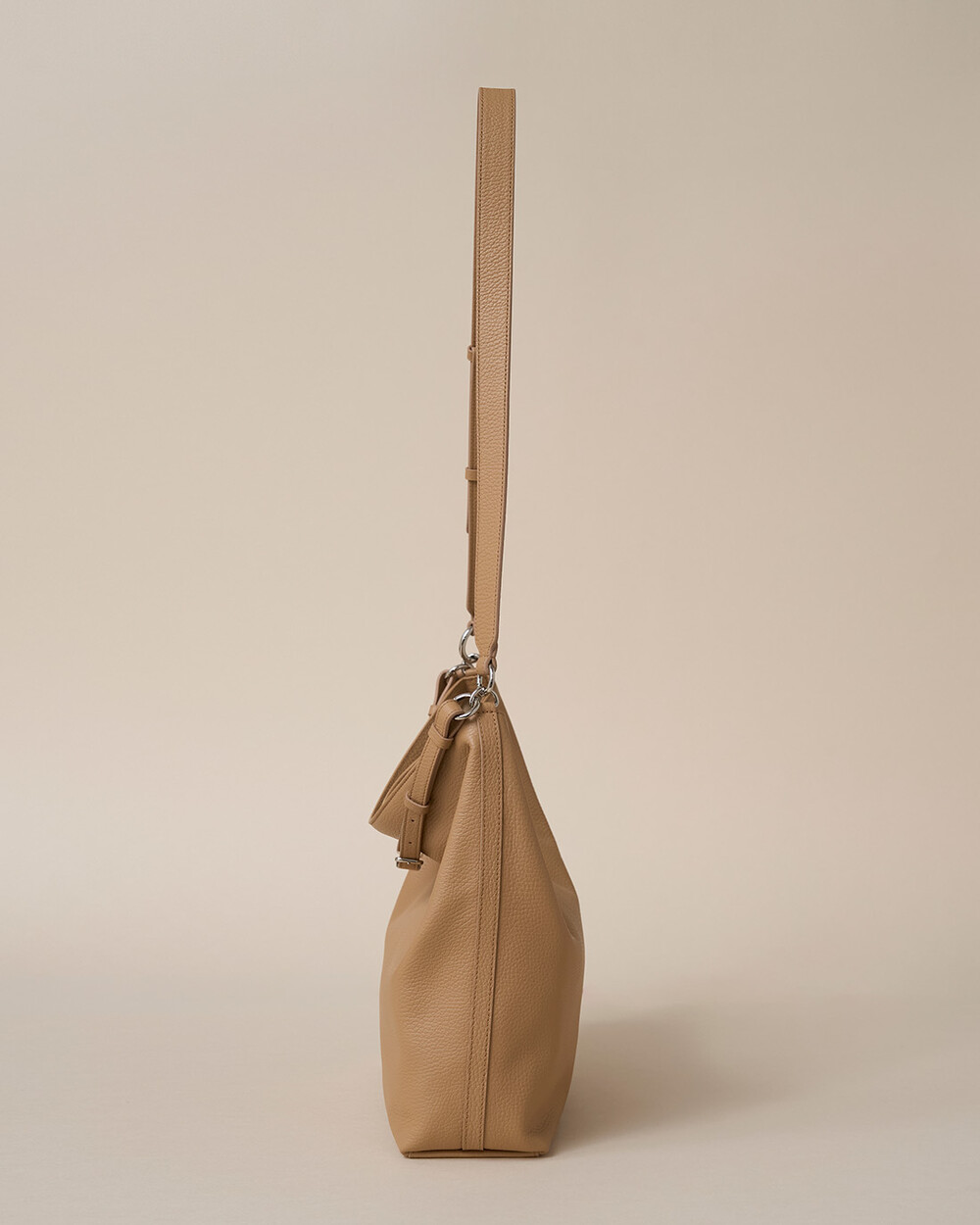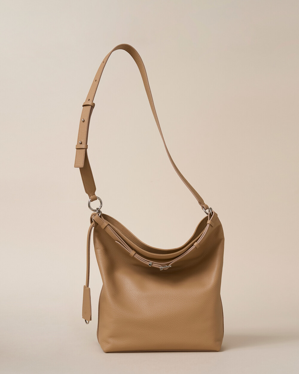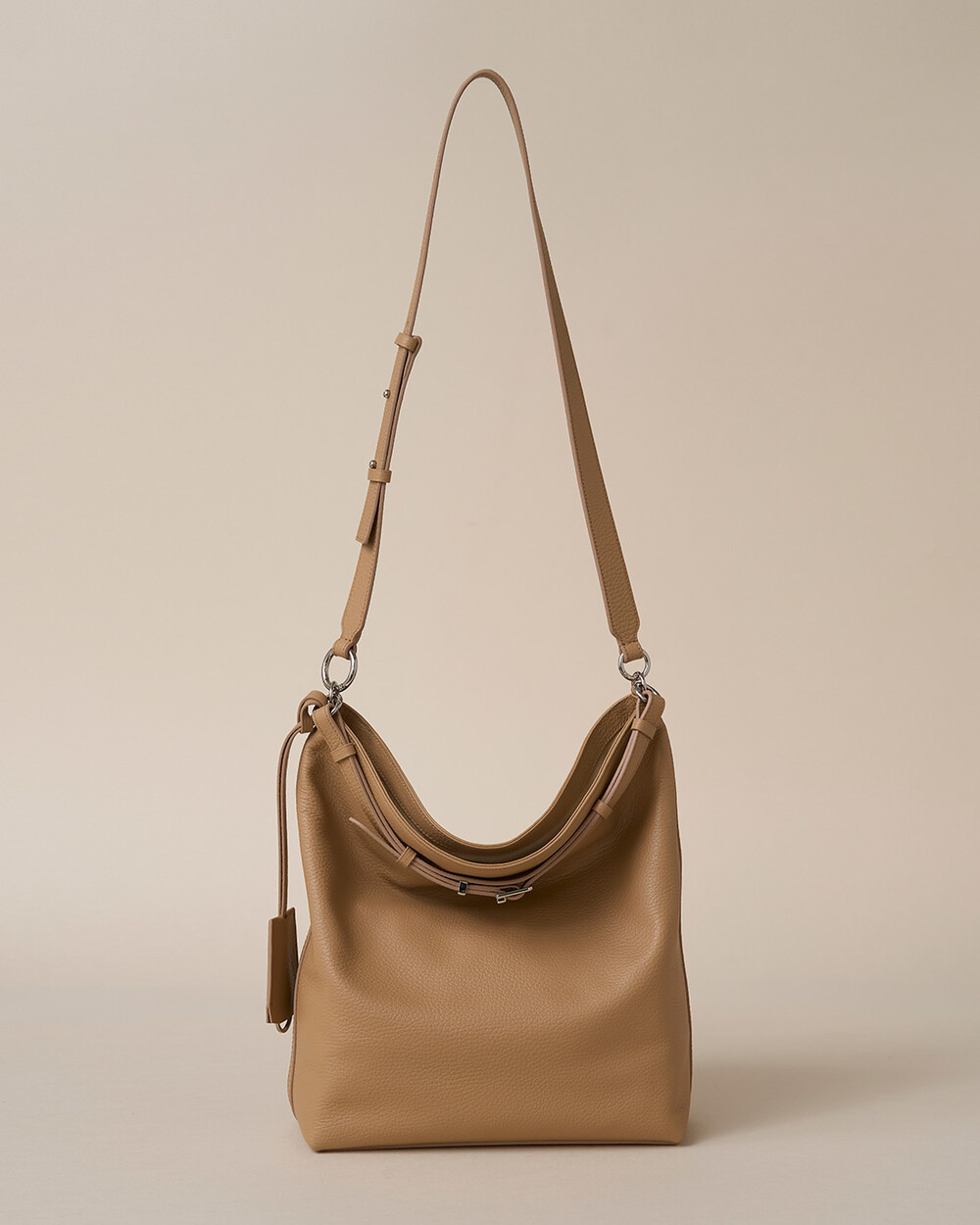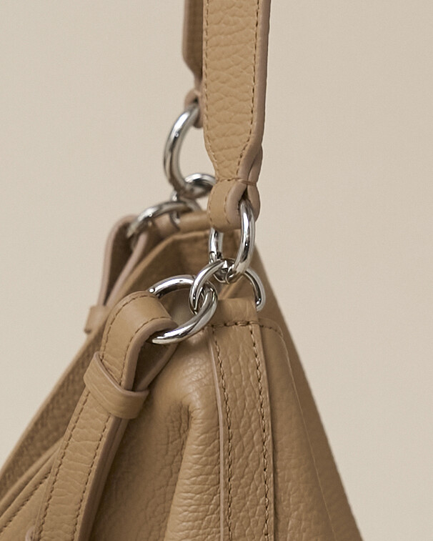 앞부분에 늘어뜨린 버클 핸들은 장식적인 효과를 주는 동시에 핸들을 들어올리면 숄더끈으로 기능합니다.
