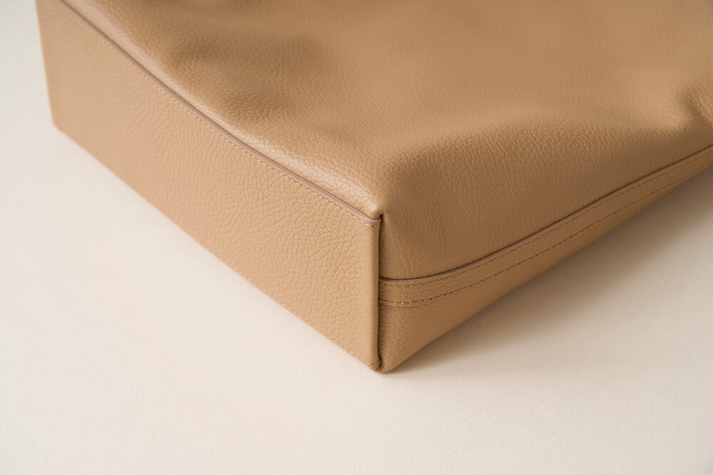 윗면이 넓고, 아랫면이 좁은 사다리꼴 형태로, 핸들을 들어올리면, 윗면이 플랩처럼 덮여 자연스러운 U자 형태의 곡선이 생기며, 내부 숨김 자석으로 부드럽게 닫힙니다. 바닥은 물건을 담더라도 쳐지지 않도록 보강했습니다.
