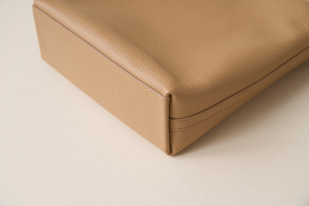 윗면이 넓고, 아랫면이 좁은 사다리꼴 형태로, 핸들을 들어올리면, 윗면이 플랩처럼 덮여 자연스러운 U자 형태의 곡선이 생기며, 내부 숨김자석으로 부드럽게 닫힙니다. 바닥은 물건을 담더라도 쳐지지 않도록 보강했습니다.