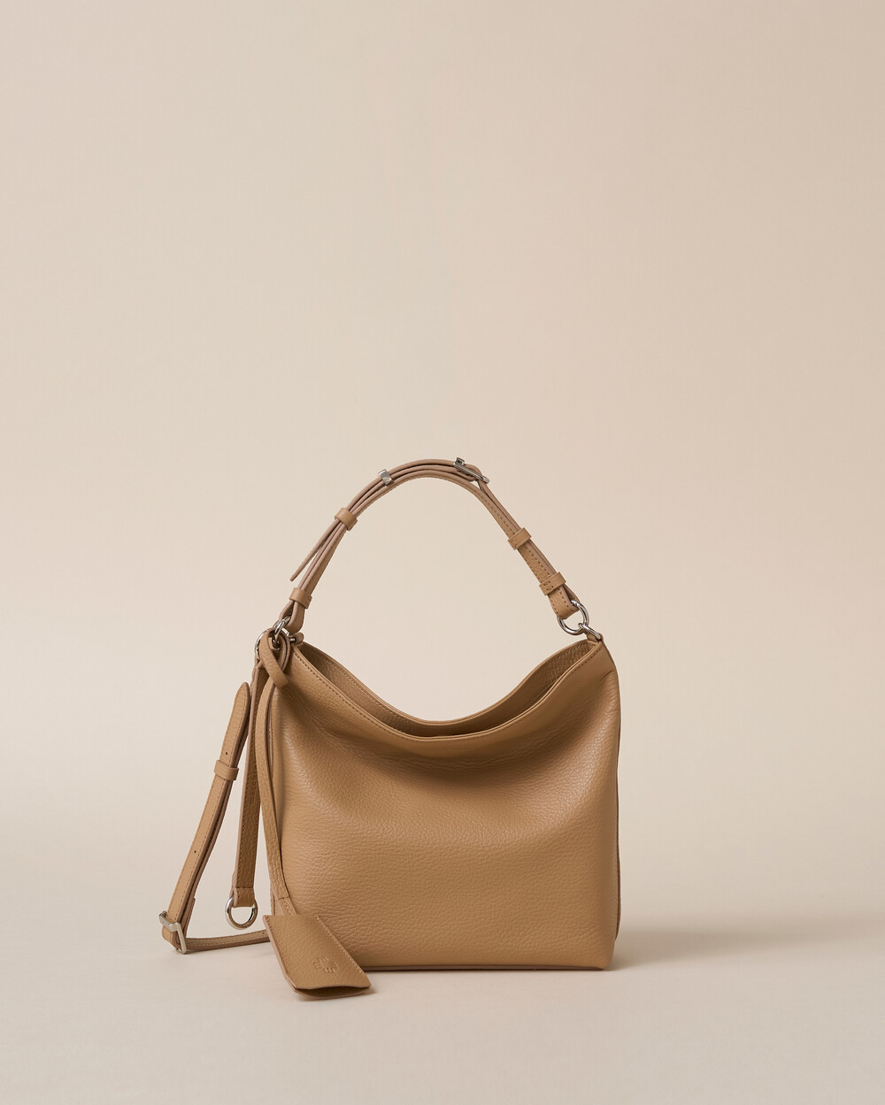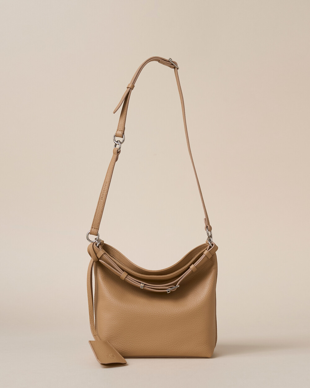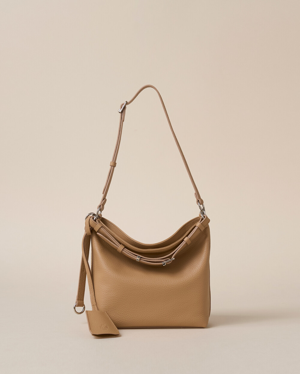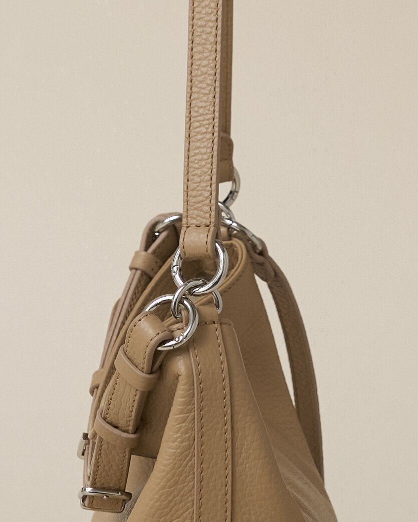 앞부분에 늘어뜨린 버클 핸들은 장식적인 효과를 주는 동시에 핸들을 들어올려 토트 스트랩으로 활용할 수 있습니다.